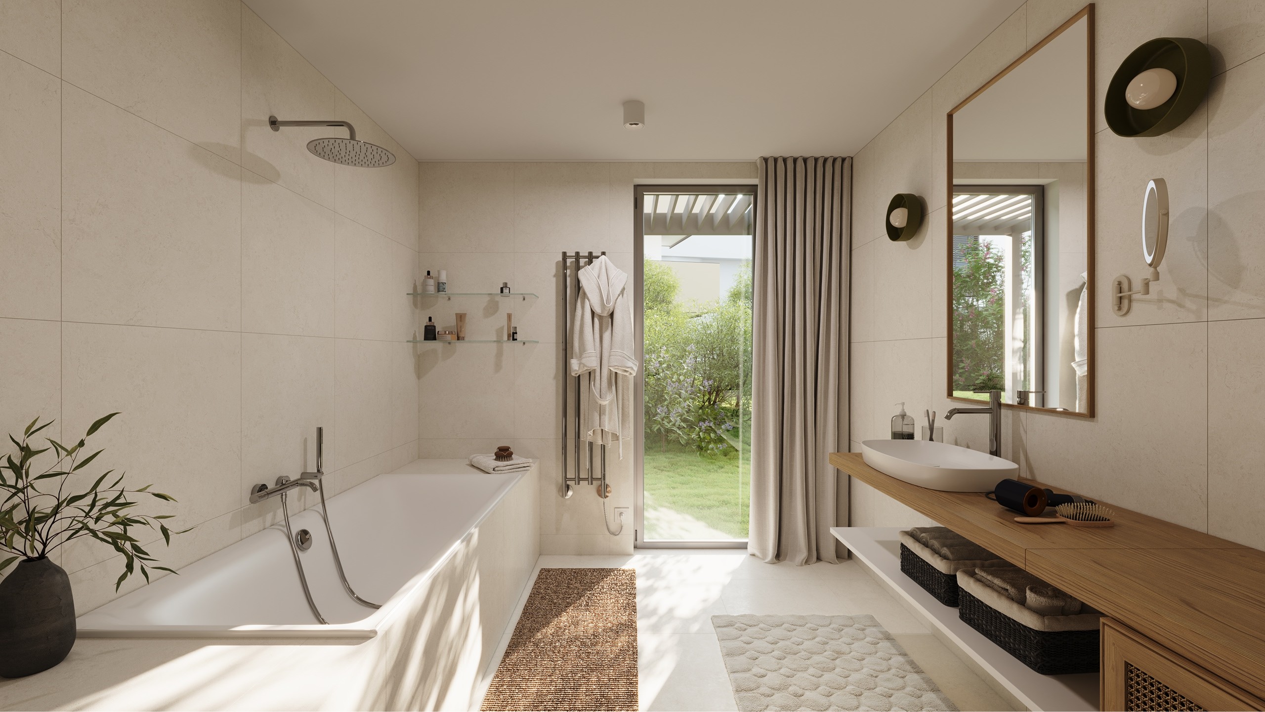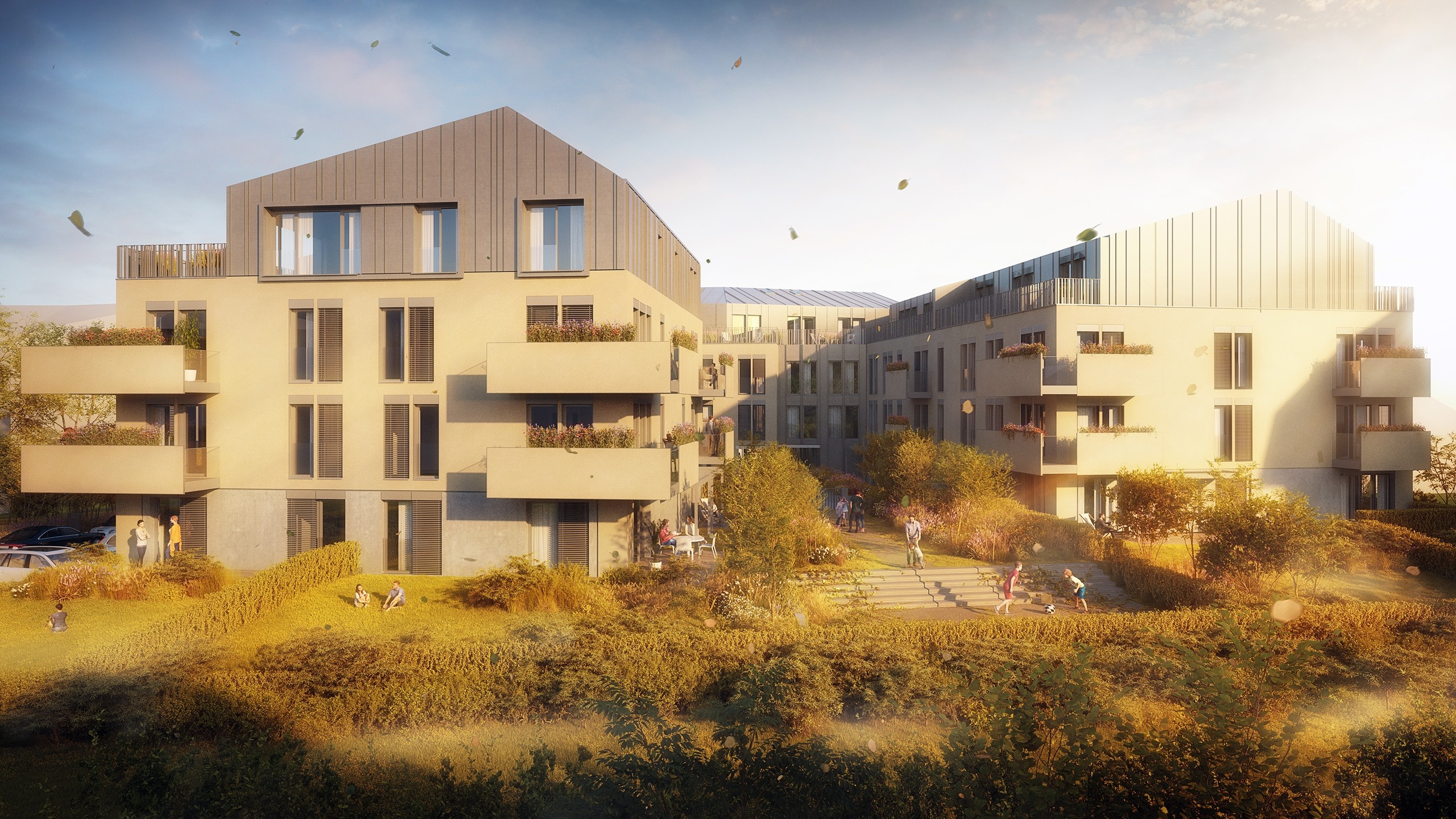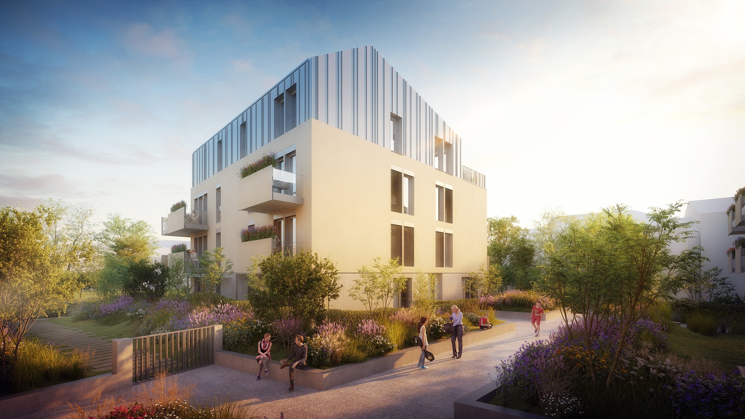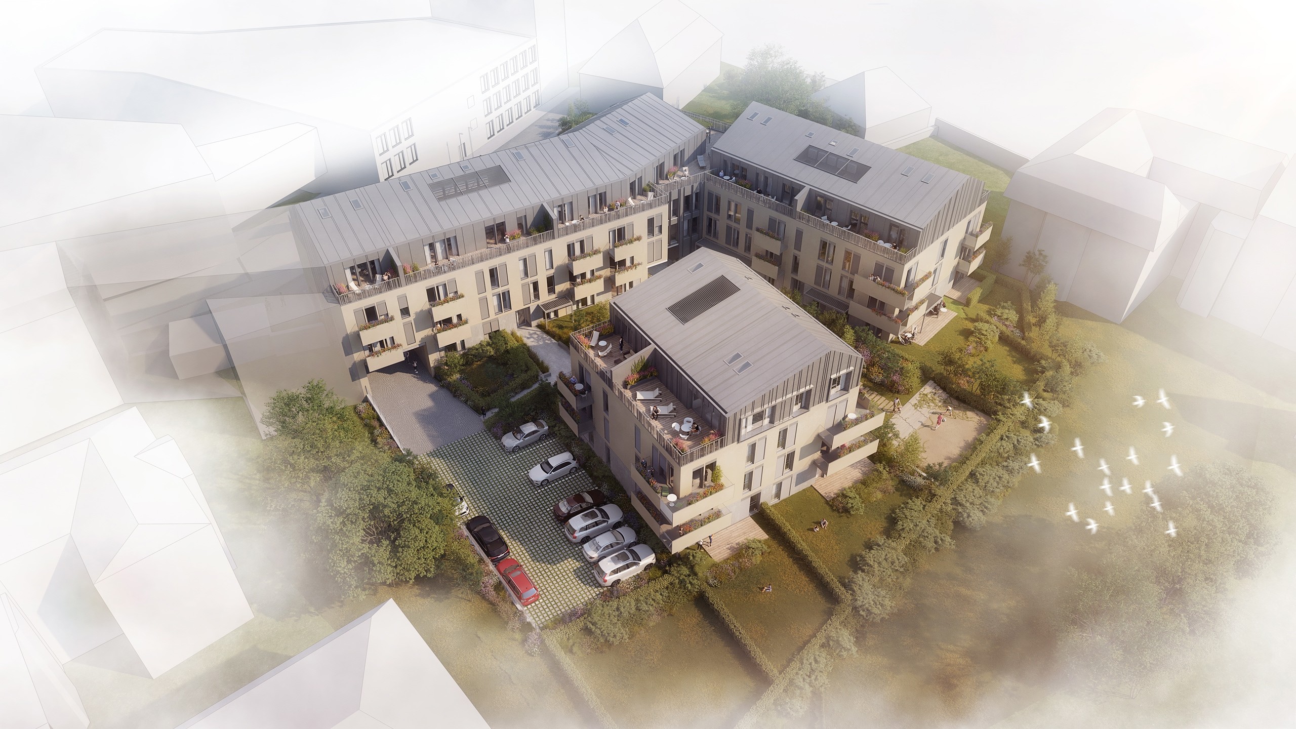 Naším cílem při tvorbě tohoto architektonického návrhu bylo doplnit hmotu polootevřeného městského bloku v ulici Na Karmeli. Zásadní výzvou bylo reagovat na stávající stavební čáru i protější budovu vysoké školy a zároveň vyhovět přísným požadavkům Odboru památkové péče. Objekt jsme proto rozdělili do tří nadzemních sekcí na společné polozapuštěné podnoži, která ukrývá 55 parkovacích stání. Zatímco uliční sekce dotvářejí nesourodý městský blok, samostatná sekce ve vnitrobloku svou sedlovou střechou záměrně připomíná tradiční vila domy v zahradě. Z materiálového hlediska jsme na základě památkových regulativů zvolili tradiční štukové omítky v pískovém a šedém odstínu a pro sedlové střechy i ustupující čtvrtá podlaží šedou plechovou falcovanou krytinu, která opticky zjemňuje měřítko budovy. Společná podnož je prakticky využita jako zelená střecha, díky níž ve vnitrobloku vzniká dojem parku se soukromými předzahrádkami i společným prostorem pro obyvatele všech 56 bytových jednotek. K historickému kontextu místa odkazuje také navrhované stromořadí, které připomíná předpokládaný průběh původní zdi klášterní zahrady. Tento projekt jsme zpracovali jako koncepční studii, jejímž strategickým cílem bylo zhodnotit potenciál pozemku a definovat pro investora maximální architektonický standard v dané lokalitě. Výsledné kompoziční řešení se zalomenou uliční frontou tak nejen definuje kvalitní rezidenční bydlení, ale záměrně usměrňuje pohled chodců na významnou historickou budovu českobratrské tiskárny.